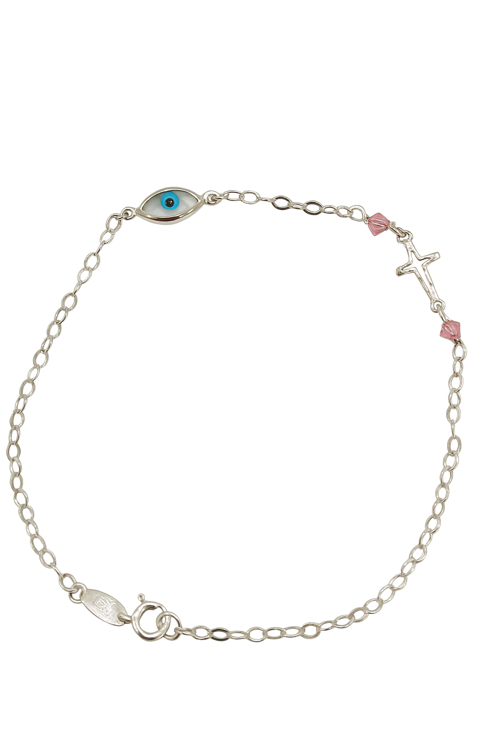 Βραχιόλι από λευκό χρυσό 9 καρατίων με ματάκι και σταυρό, διακοσμημένο με ροζ χάντρες. Ένα διακριτικό και...