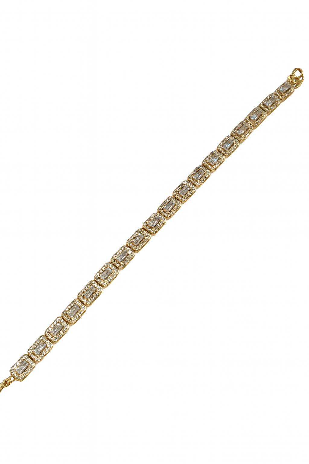 Εντυπωσιακό βραχιόλι από Ασήμι 925 με χρυσή επιμετάλλωση και λαμπερές ζιργκόν πέτρες σε ορθογώνια κοψίματα, που χαρίζουν...